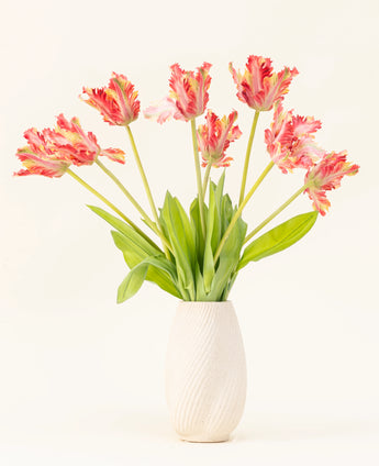 Lleve la primavera a su hogar con el ramo de flores artificiales de seda Tulipán periquito francés rojo/amarillo, compuesto por ocho impresionantes tallos. Las distintivas llamas rojas y amarillas de los exclusivos tulipanes periquito conforman un ramo vibrante y expresivo que atrae la atención al instante. Este ramo rezuma estilo, ideal para quienes se atreven con el color y el carácter.