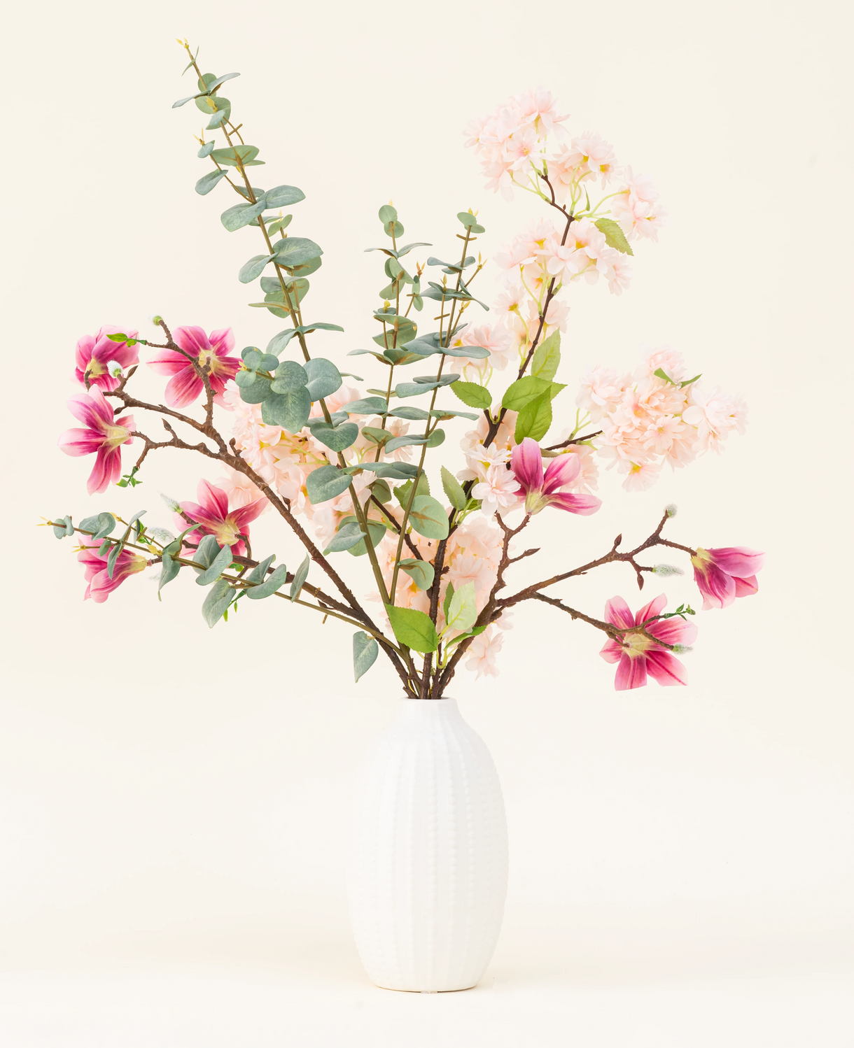 Traiga un toque de refinamiento y tranquilidad a la casa con las flores de plumas de ramo de flores artificiales de seda. Este ramo elegantemente compuesto consta de tres ramas cuidadosamente seleccionadas: la belleza atemporal de la magnolia, la fresca suavidad de la hoja de eucalipto y el toque romántico de la flor de cerezo rosa claro.