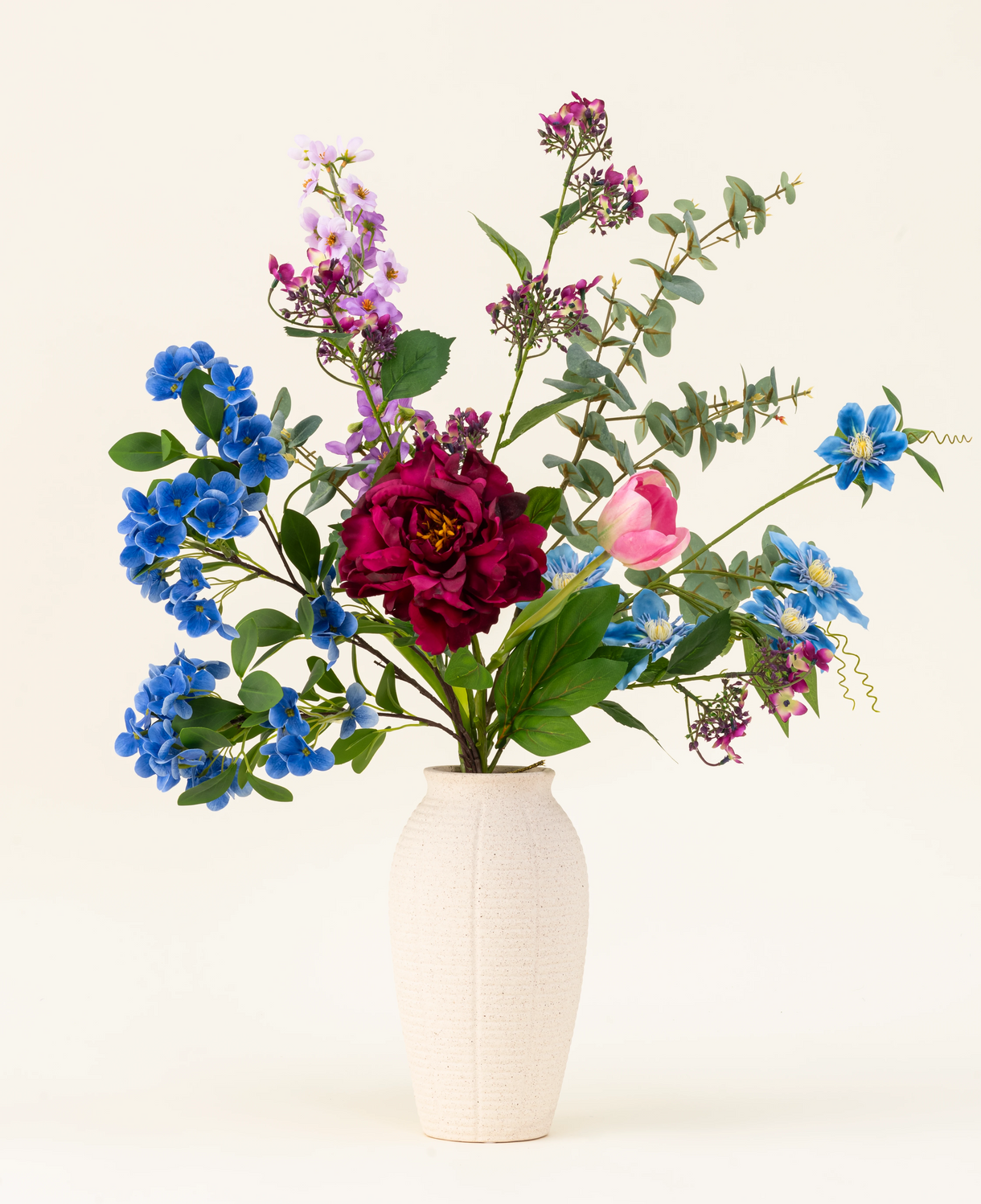 El bouquet está cuidadosamente compuesto y contiene una rica mezcla de flores de seda, que incluye un toque real de bola de nieve, clematis doble, hortensia salvaje, tulipán francés, peonía, delfinio y eucalipto. Esta...